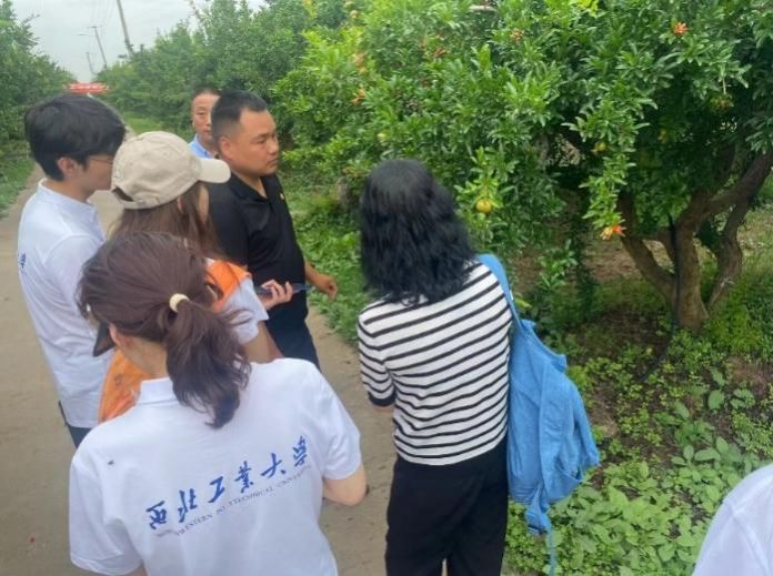 图为实践队员与石榴园区种植技术人员交流
