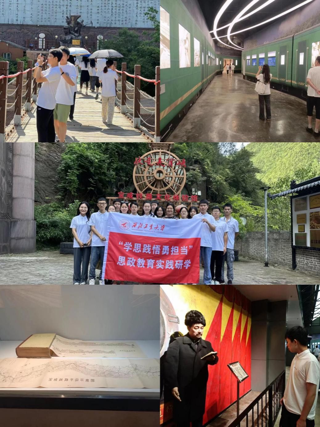 实践队进入了灵官峡的文化体验馆,狭长的体验馆里放映的是建设宝成铁路的珍贵影像,修建宝成铁路遗留下来的工具今天依稀可见,英雄人物的蜡像栩栩如生,人工绘制的图纸文件精密表达了艰苦年代工程师们的伟大构想,火车厢一般的体验馆构造也映衬了宝成铁路的文化主题。