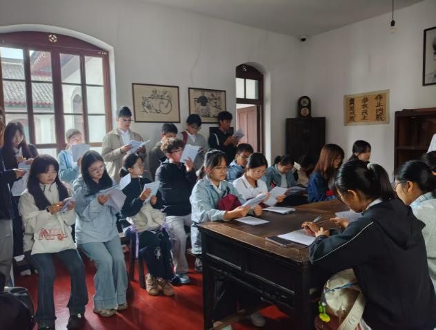 随后,师生们在纪念馆救亡室开展专题读书会。辅导员董润老师结合历史背景与文本内容,深入浅出地讲解了《论持久战》蕴含的战略思想和哲学智慧。为帮助同学们更好地理解著作中“内线作战与外线作战”的辩证关系,董润邀请同学们进行情景演示,演示结束后,大家豁然开朗,纷纷表示“以前阅读《论持久战》时,对于‘内线和外线’的理解不深入,今天通过情景演示一下子就懂了”,“这就是‘矛盾的对立统一’‘具体问题具体分析’的生动体现!”。
