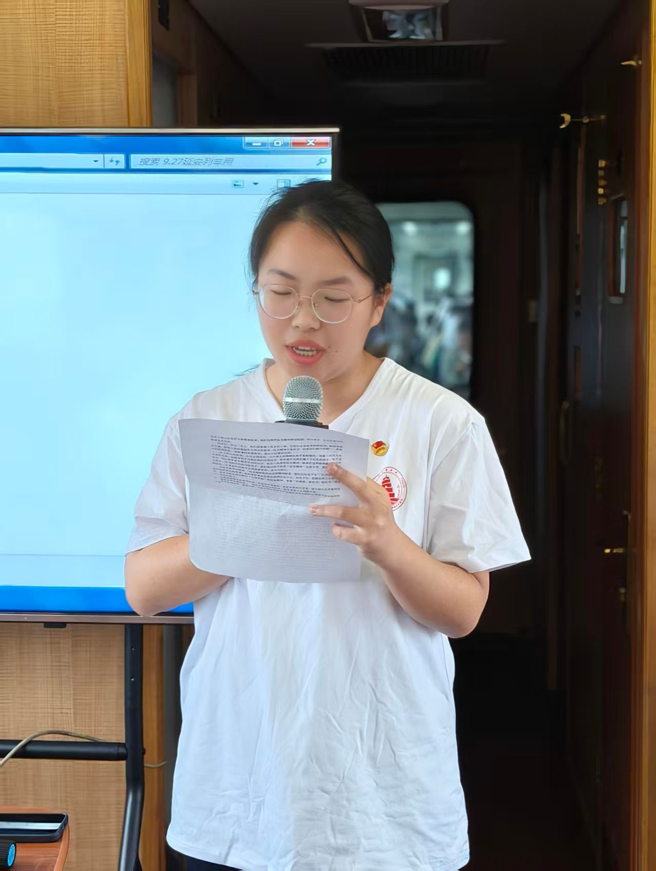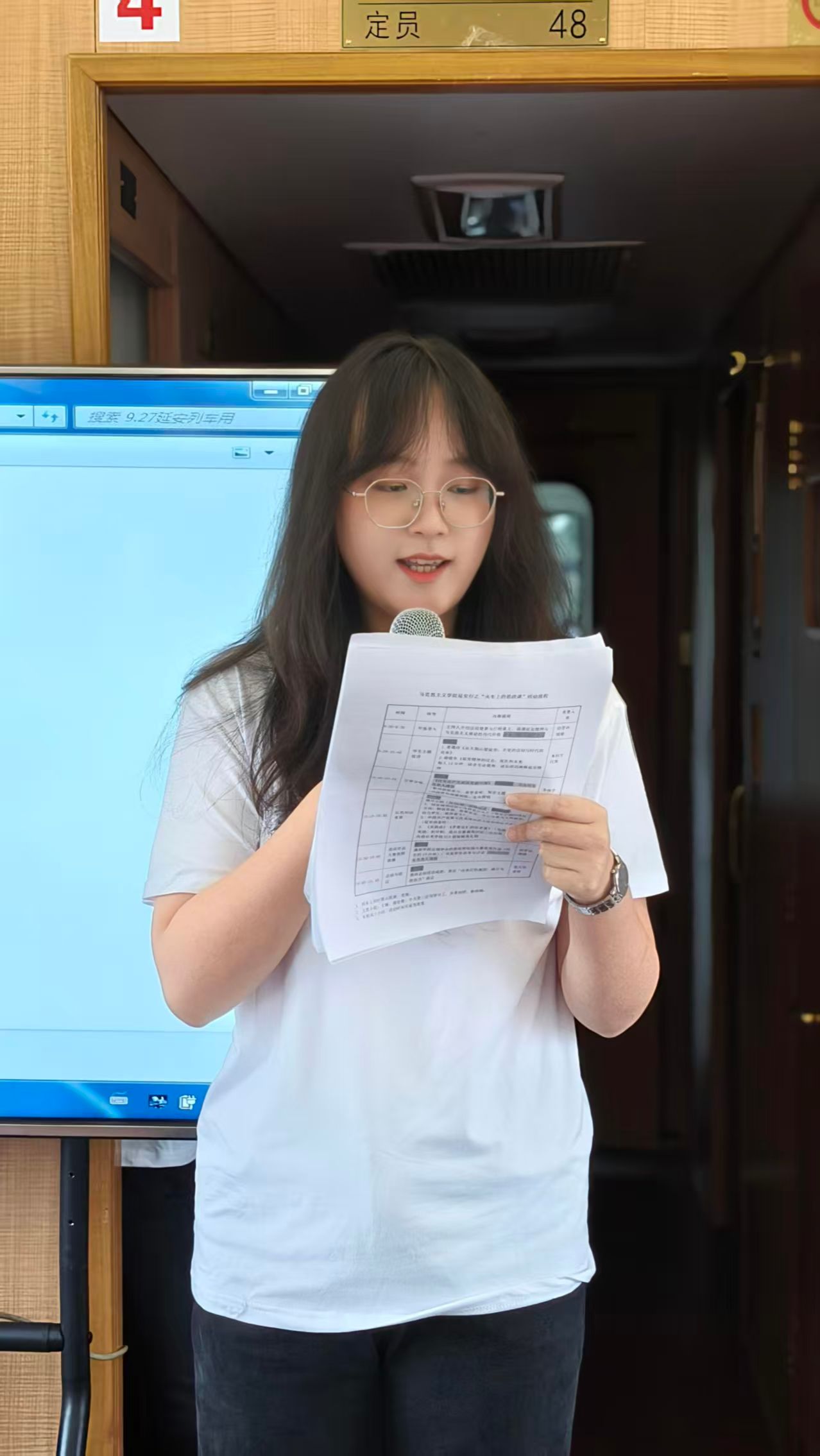 随后,孙瑞璇同学带领大家合唱《没有共产党就没有新中国》,歌声嘹亮,深切表达了同学们对党的坚定拥护和真挚情感,车厢内气氛热烈,掌声经久不息。