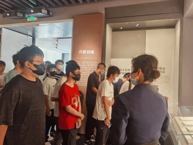 最后,研学团队参观了西安国家版本馆结合陕西文化特色精心设置的两个展览。《楮墨遗珍万里同风——丝绸之路版本展》以丝绸之路文化为主题,以古丝绸之路文献版本为基础,以陕西典藏为依托,展出约600种展品,充分展示版本文化,讲述版本里的丝路故事,展现丝绸之路文明。《赓续文脉踔厉前行——中华文化经典版本展(西部篇)》则以中华文化的经典著作版本为依托,立足西部,集中展出能够彰显民族根脉、延安精神、伟大复兴“中国梦”的中华文化经典,以期增强文化自信,提升全社会的凝聚力和向心力,为新时代开创党和国家事业新局面提供坚强思想保证和强大精神力量。同学们边听边看,在丰富的文献版本资料中,感受中华优秀传统文化和社会主义先进文化,体会传承悠久文明、赓续中华文脉的意义和价值。