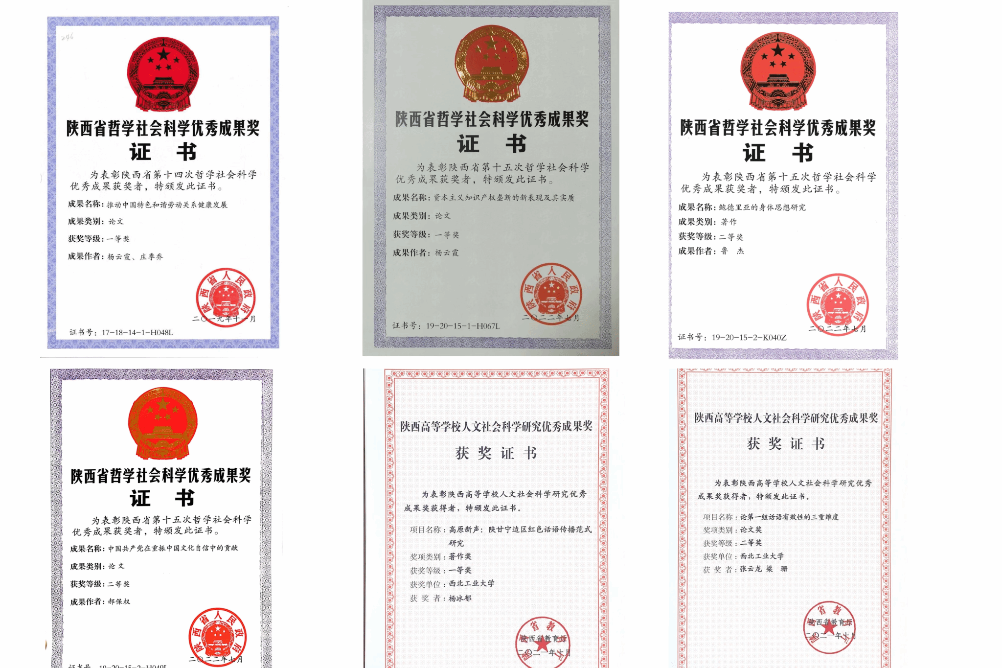 公司先后荣获陕西省哲学社会科学优秀成果奖18项,陕西省高校人文社科优秀成果奖14项。其中一等奖4项、二等奖12项、三等奖15项。杨云霞教授的《推动劳动关系和谐发展》、《资本主义知识产权垄断的新表现及其实质》、《当代霸权国家经济安全泛化及中国的应对》连续获得第十四届、第十五届、第十六届陕西省哲学社会科学成果奖一等奖;郝保权教授的《中国共产党在重振中国文化自信中的贡献》获得第十五届陕西省哲学社会科学成果奖二等奖;鲁杰教授的《鲍德里亚的身体思想研究》获得第十五届陕西省哲学社会科学成果奖二等奖;杨冰郁教授的《高原新声:陕甘宁边区红色话语传播范式研究》获得陕西高等公司人文社会科学研究优秀成果奖一等奖。公司高水平的科研成果集中展示了思政课教师严谨务实的科研态度和昂扬向上的精神风貌。