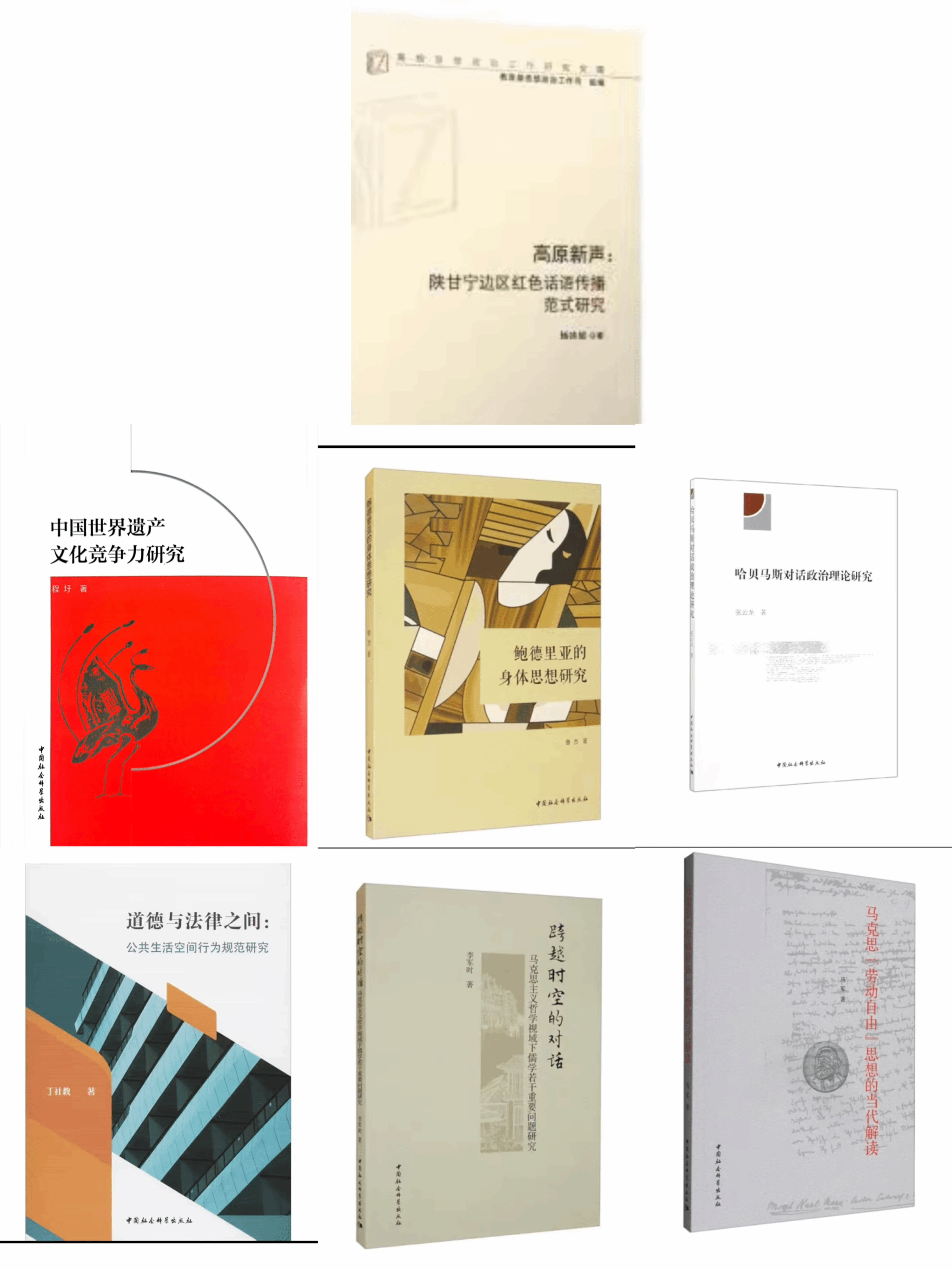 程圩教授的《中国世界遗产文化竞争力研究》、鲁杰教授的《鲍德里亚的身体思想研究》、张云龙教授的《哈贝马斯对话政治理论研究》、丁社教教授的《道德与法律之间:公共生活空间行为规范研究》、李军时副教授的《跨越时空的对话——马克思主义哲学视域下儒学若干重要问题研究》、马军讲师的《马克思“劳动自由”思想的当代解读》等著作被中国社会科学出版社出版,运用习近平新时代中国特色社会主义思想的世界观和方法论,丰富和发展了马克思主义理论所揭示的一般规律,共同谱写了马克思主义的时代新篇。